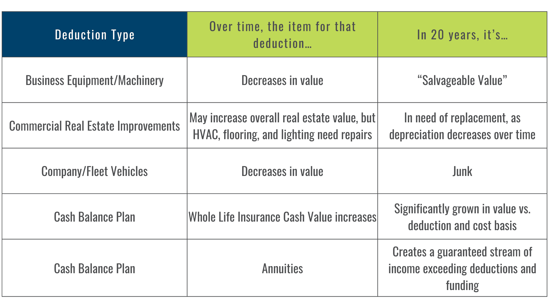 We prefer to take deductions to buy growing assets, not take deductions for assets that decrease in value over time (such as heavy vehicles, amortized furniture, etc.). For this reason, cash balance plans are our favorite type of deduction! Consider the longevity of different deductions a business owner may take: